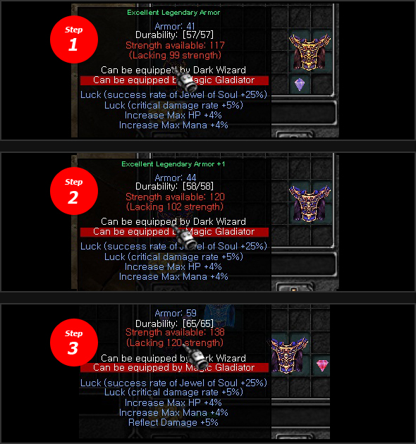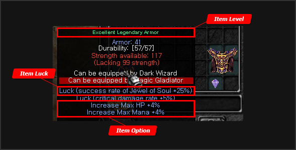 0 ~ 6 | Upgraded with 💎 Jewel of Bless (100% success) or 💎 Jewel of Soul (50% success chance). When a 💎 Jewel of Soul fails it reduces the level of the item with 1. Items at level 3 and 4 have a dark red tint. items at level 5 and 6 have a dark blue tint. |