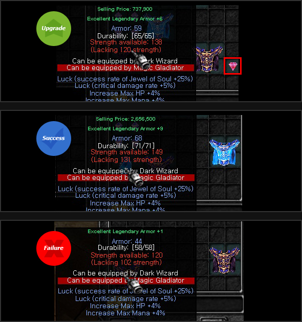 7 ~ 9 | Upgraded with 💎 Jewel of Soul (50% success chance). When a 💎 Jewel of Soul fails for 7 it reduces the level of the item with 1. When it fails for 8 or 9 it reduces the level of the item back to 0. Items at level 7 and 8 have a slight glow usualy in the color of the item. Items at level 9 have a stronger glow. |